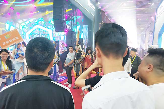 画风意外的和谐啊!没错,这就是GETshowmile米乐集团展位5B-04A现场,LED屏与灯光将空间立体化,同时,俊男靓女们将王者荣耀cosplay也搬到了现场,王昭君、大乔、花木兰、妲己、马可波罗、至尊宝……,真的是身材颜值应有尽有,好一番视觉盛宴!